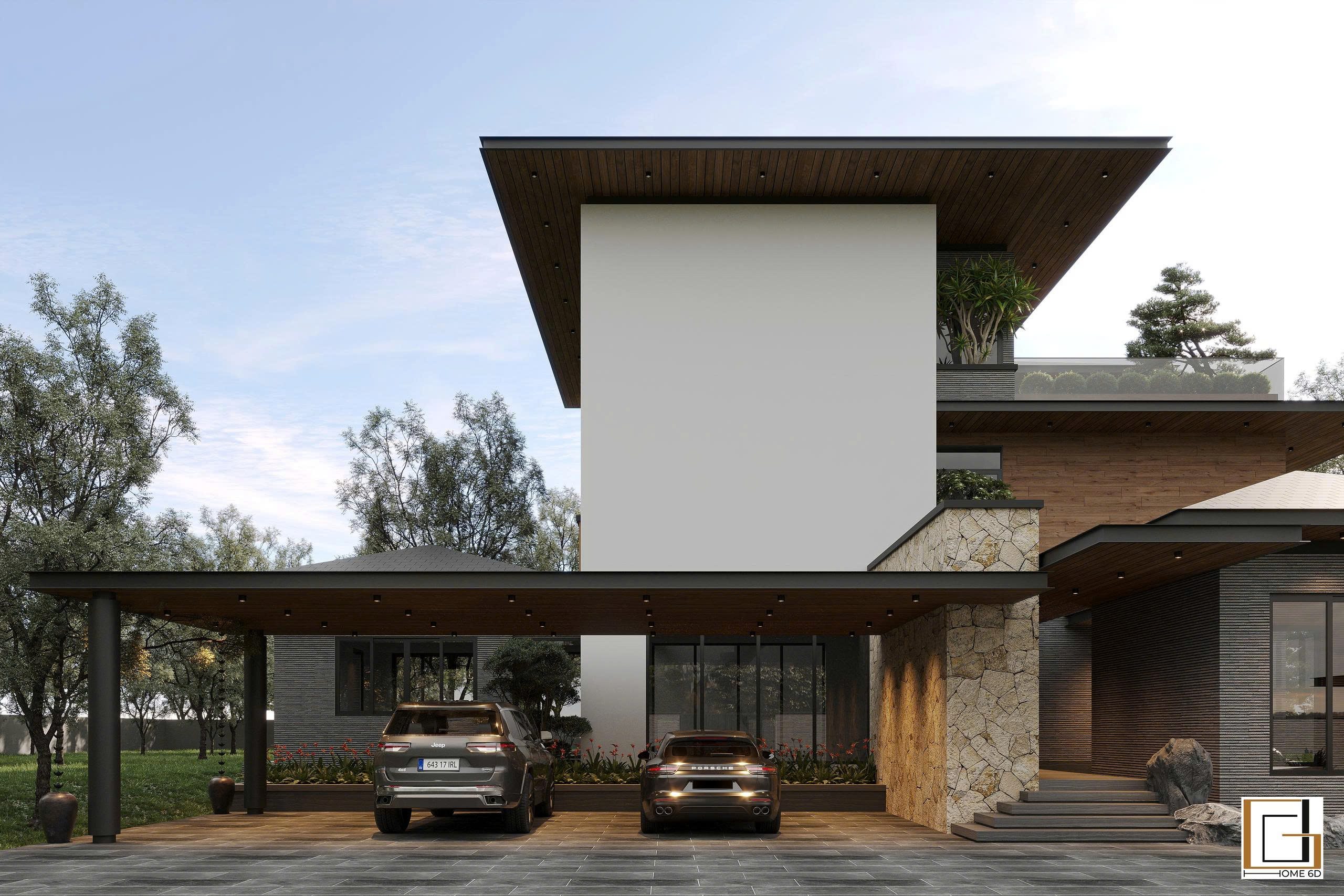 Ngay từ mặt tiền, ngôi nhà đã thể hiện rõ giá trị thẩm mỹ của phong cách Modern Tropical. Kiến trúc sư Nhadep 6D lựa chọn tone màu trung tính hiện đại, kết hợp các vật liệu như gỗ nhựa ngoài trời, đá ốp tường, lam chắn nắng và hệ kính cường lực lớn. Từng chi tiết đều góp phần tạo nên hiệu ứng thị giác mạnh mẽ mà không hề “bội thực”, giúp công trình giữ được sự thanh lịch và sang trọng.