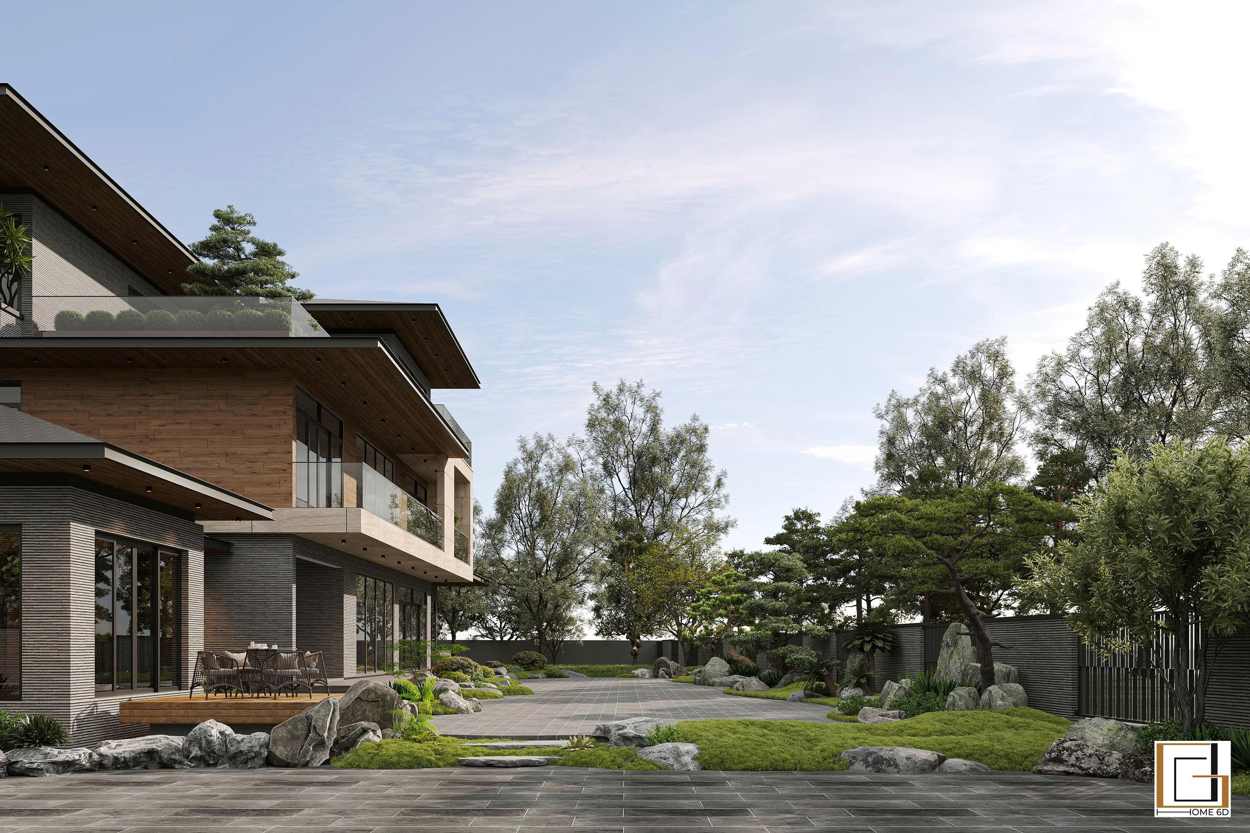 Không gian xanh cũng được đẩy mạnh với cây nhiệt đới, bồn hoa, tiểu cảnh và khoảng thông tầng, tạo sự mềm mại và cân bằng trong bố cục tổng thể.