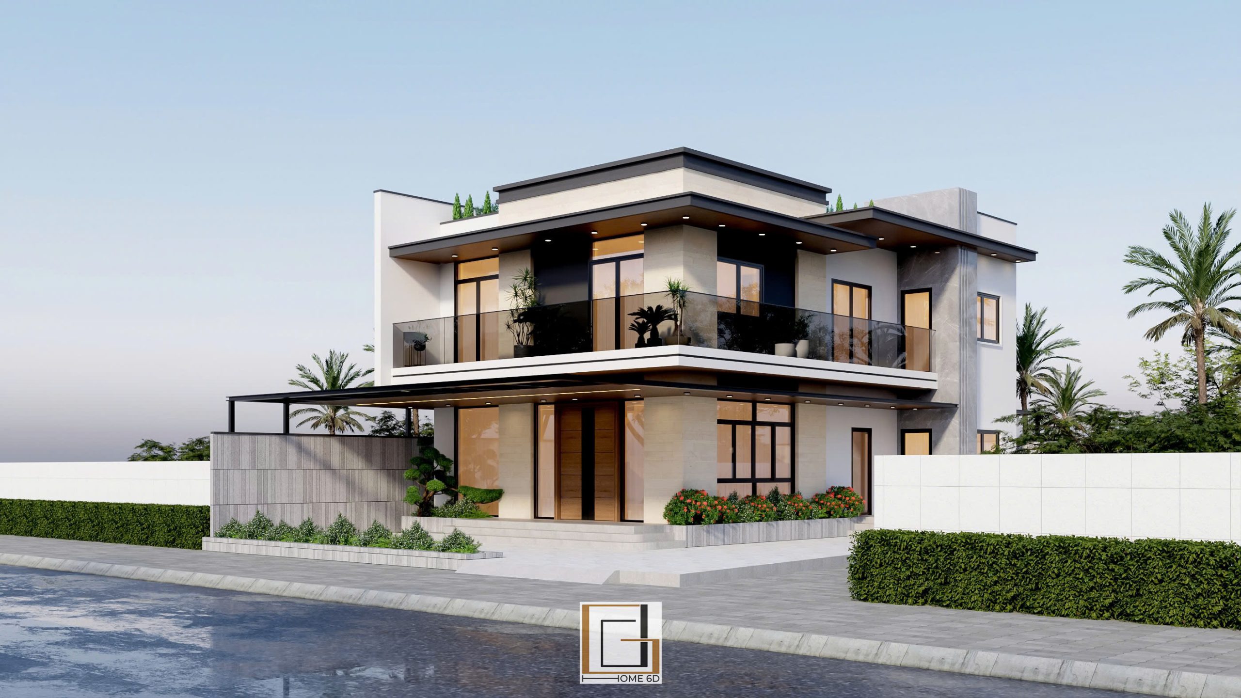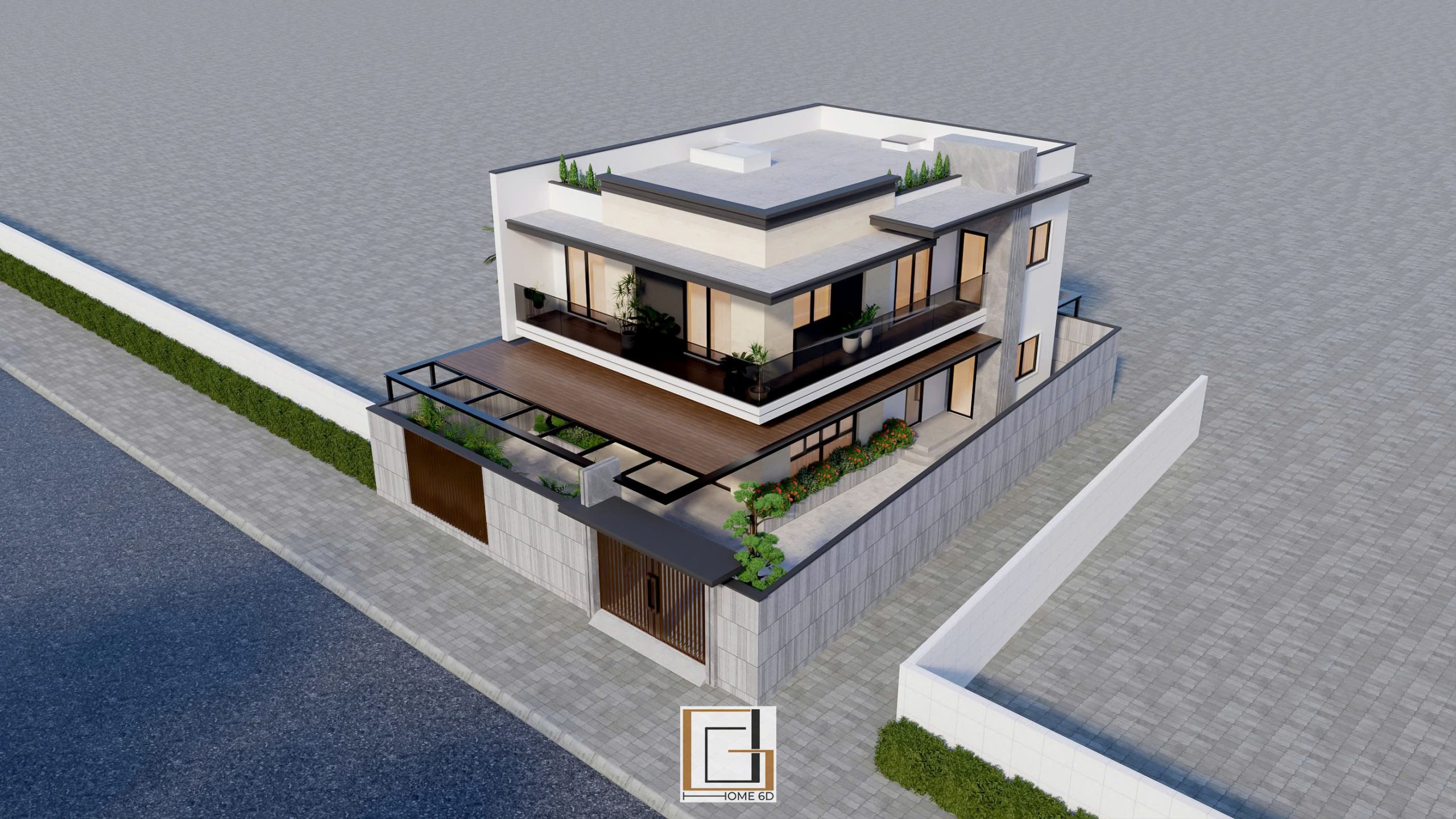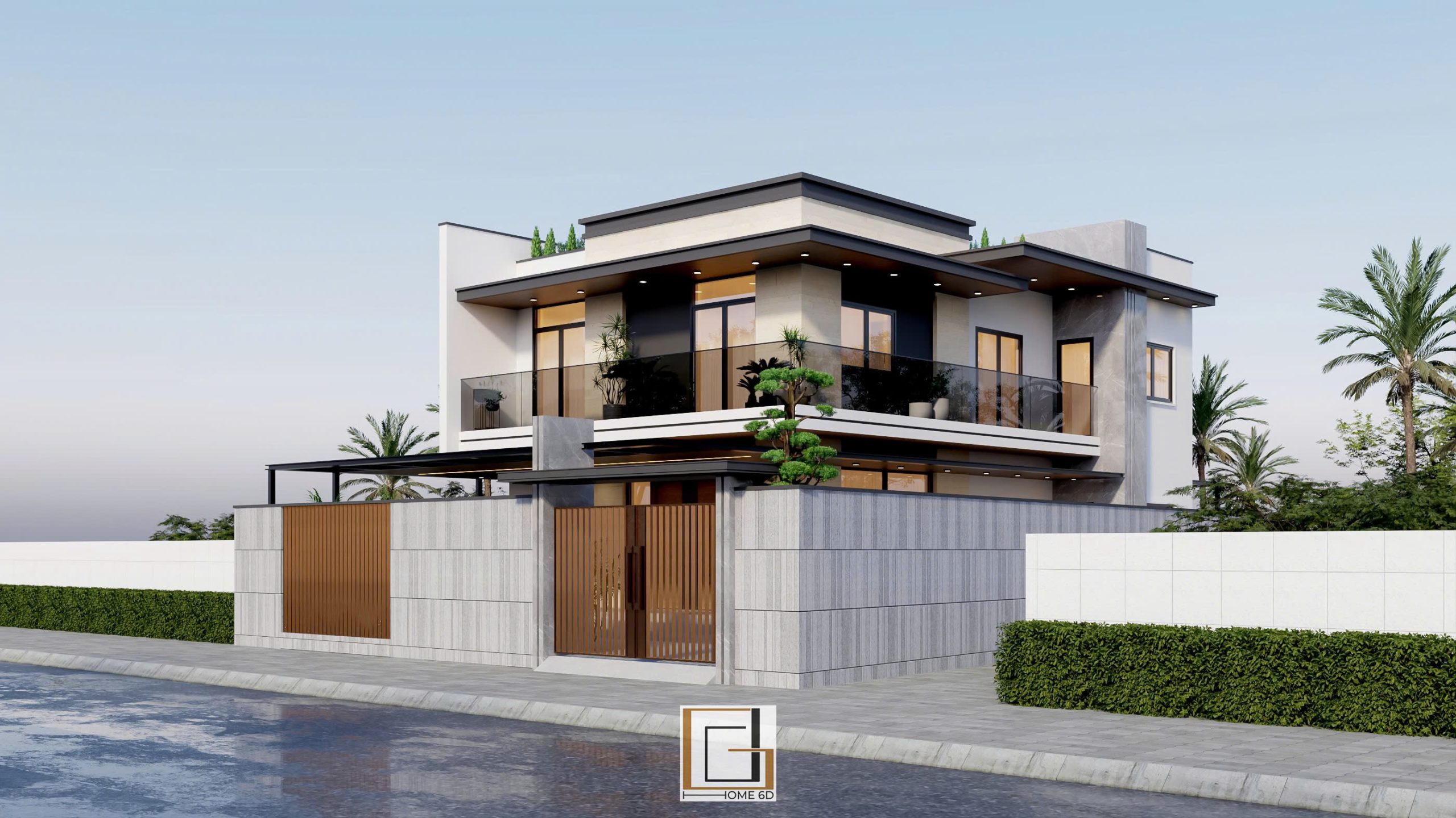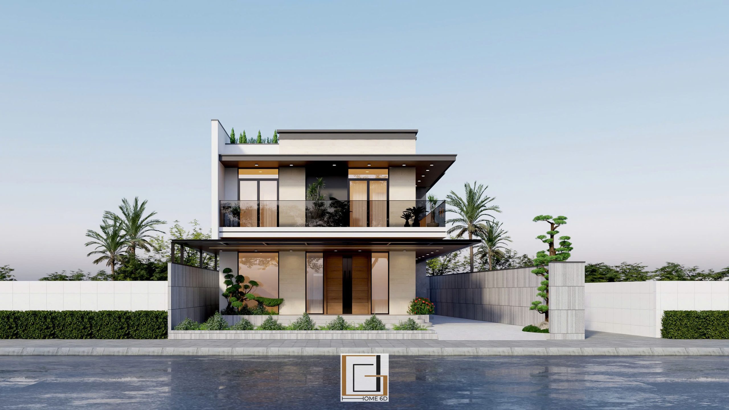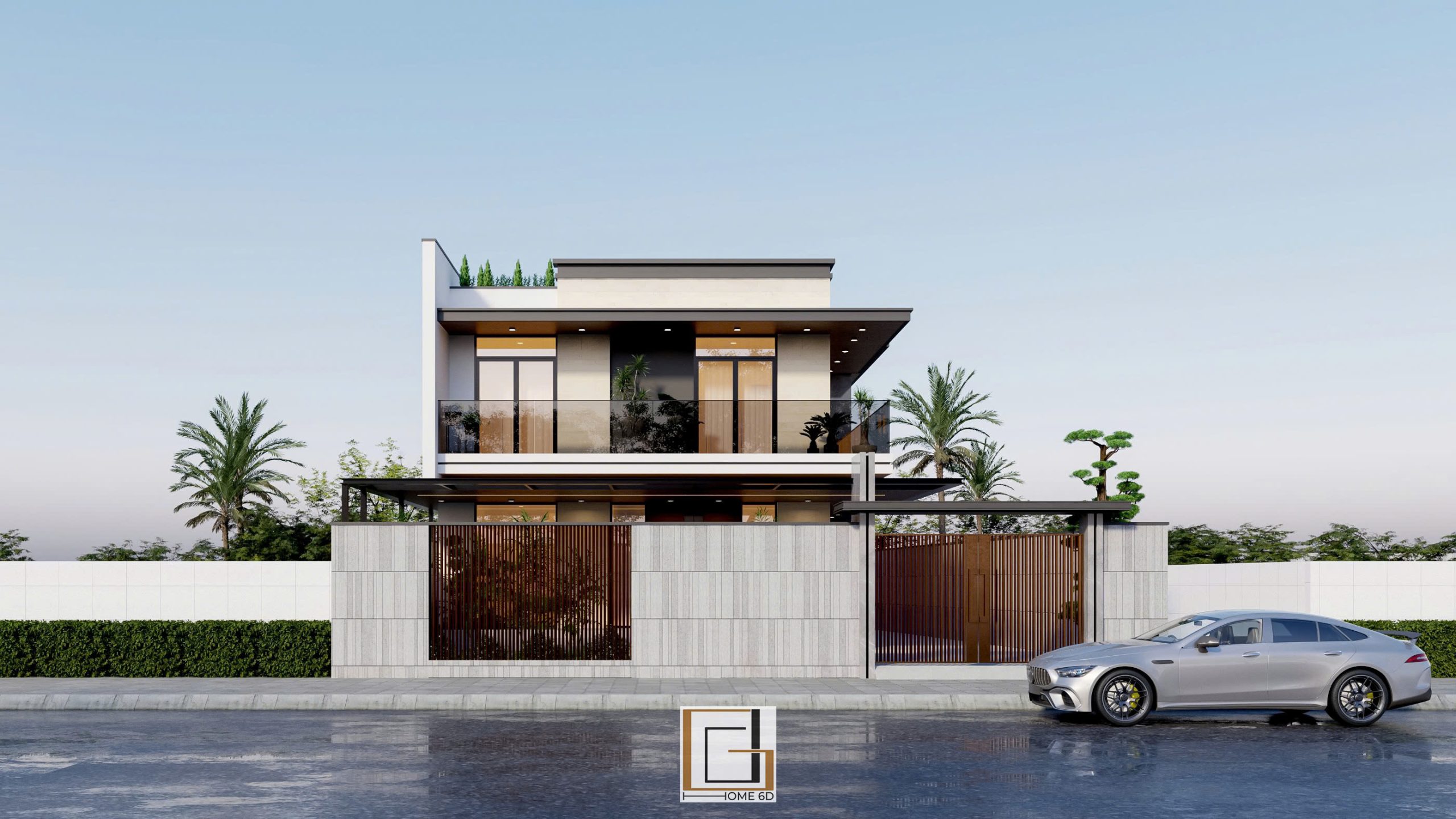 Ngay từ cái nhìn đầu tiên, công trình đã gây ấn tượng bởi tỷ lệ cân đối và bố cục rõ ràng. Các khối kiến trúc được sắp xếp vuông vắn, liên kết chặt chẽ nhưng không hề cứng nhắc. Từng mảng tường, chi tiết lan can hay khung cửa đều được xử lý tỉ mỉ, thể hiện tư duy thiết kế tinh gọn và khoa học của đội ngũ kiến trúc sư Nhà đẹp 6D.