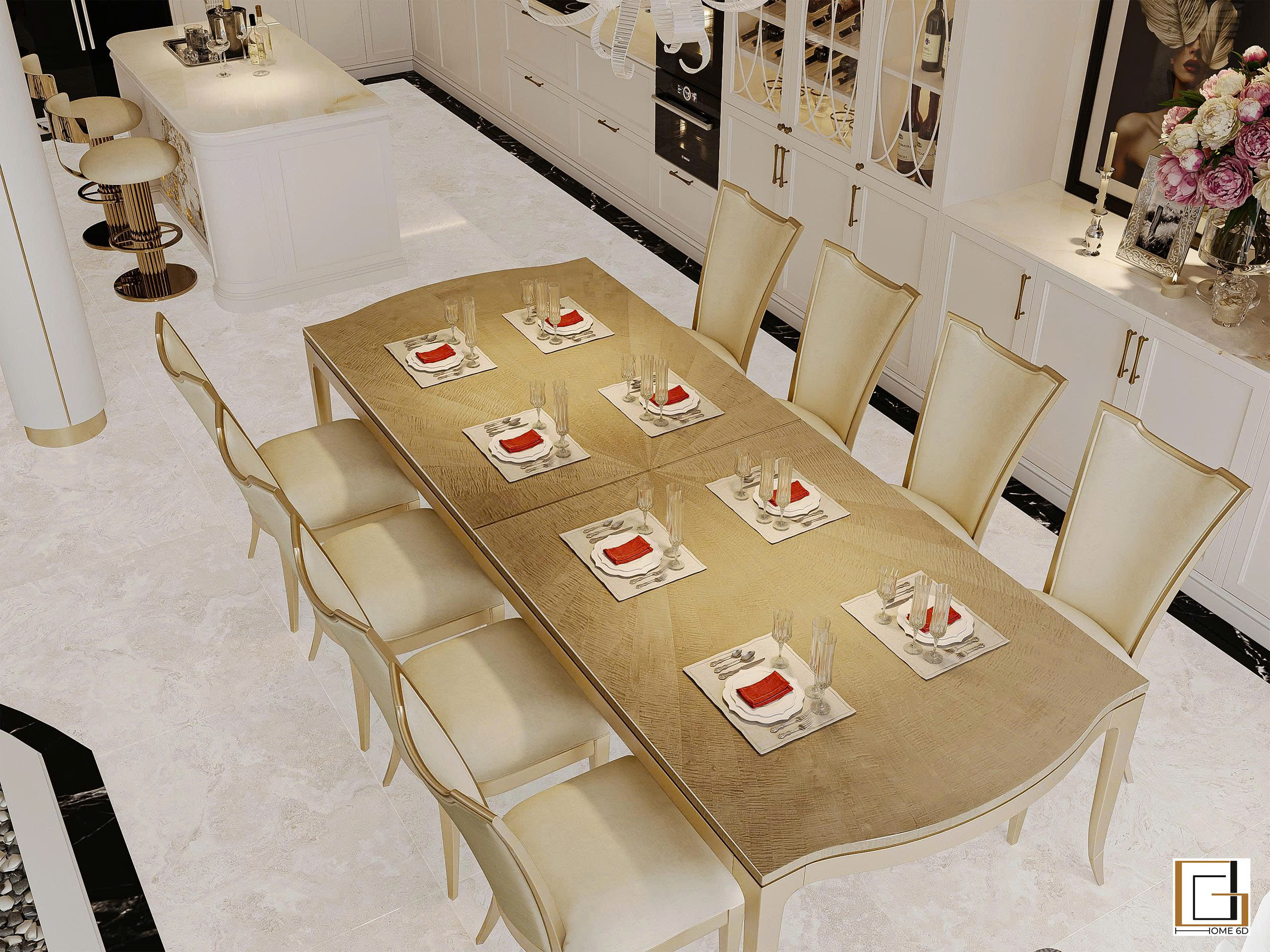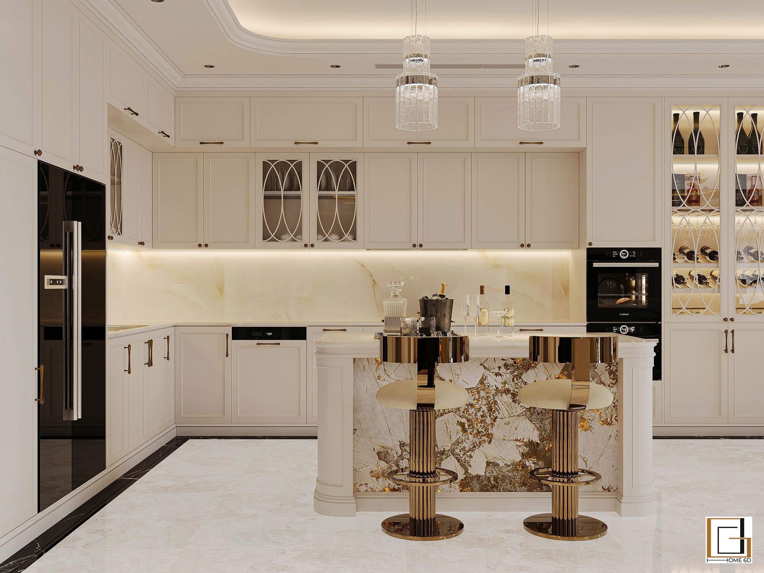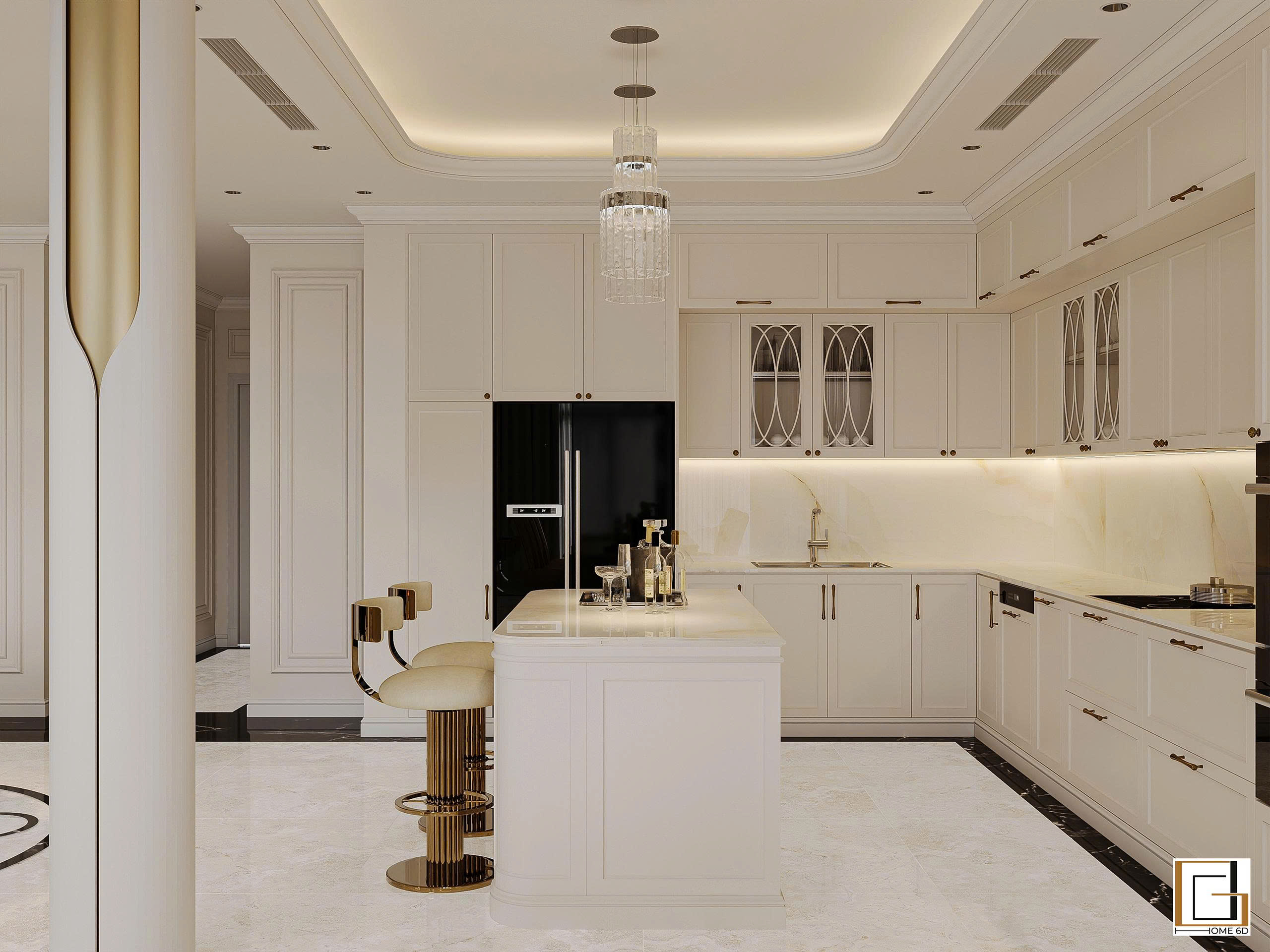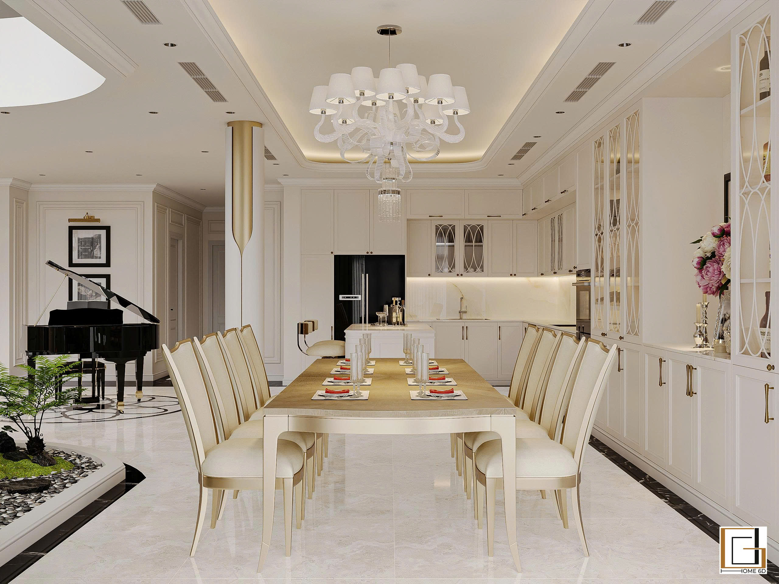 Khu bếp – ăn được thiết kế liền kề, với bộ bàn ăn 10 ghế sang trọng, mặt bàn đá trắng vân mây kết hợp khung gỗ sồi sơn vàng ánh kim. Tủ bếp được làm bằng gỗ công nghiệp chống ẩm phủ sơn Inchem, kết hợp cùng hệ thống thiết bị bếp thông minh nhập khẩu châu Âu, mang đến trải nghiệm nấu nướng tiện nghi và hiện đại. Màu sắc, ánh sáng và vật liệu được xử lý khéo léo giúp khu vực này vừa sang trọng, vừa giữ được sự ấm cúng – đúng tinh thần của một “trái tim ngôi nhà”.
