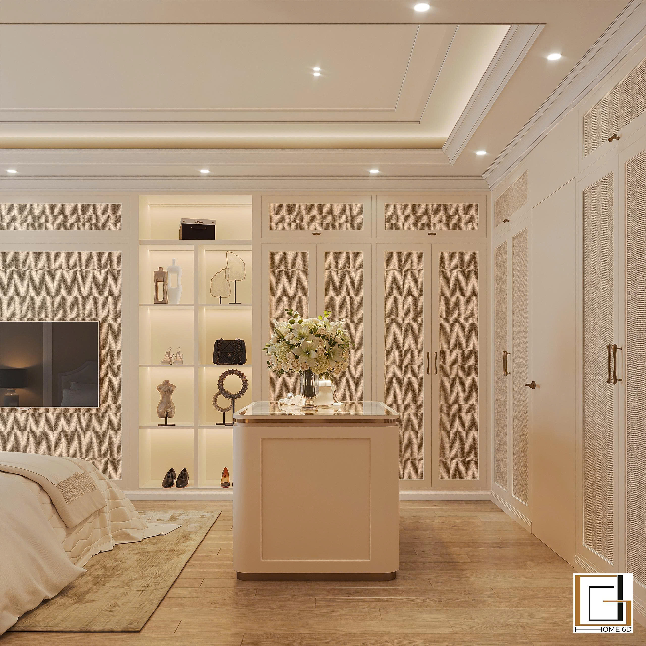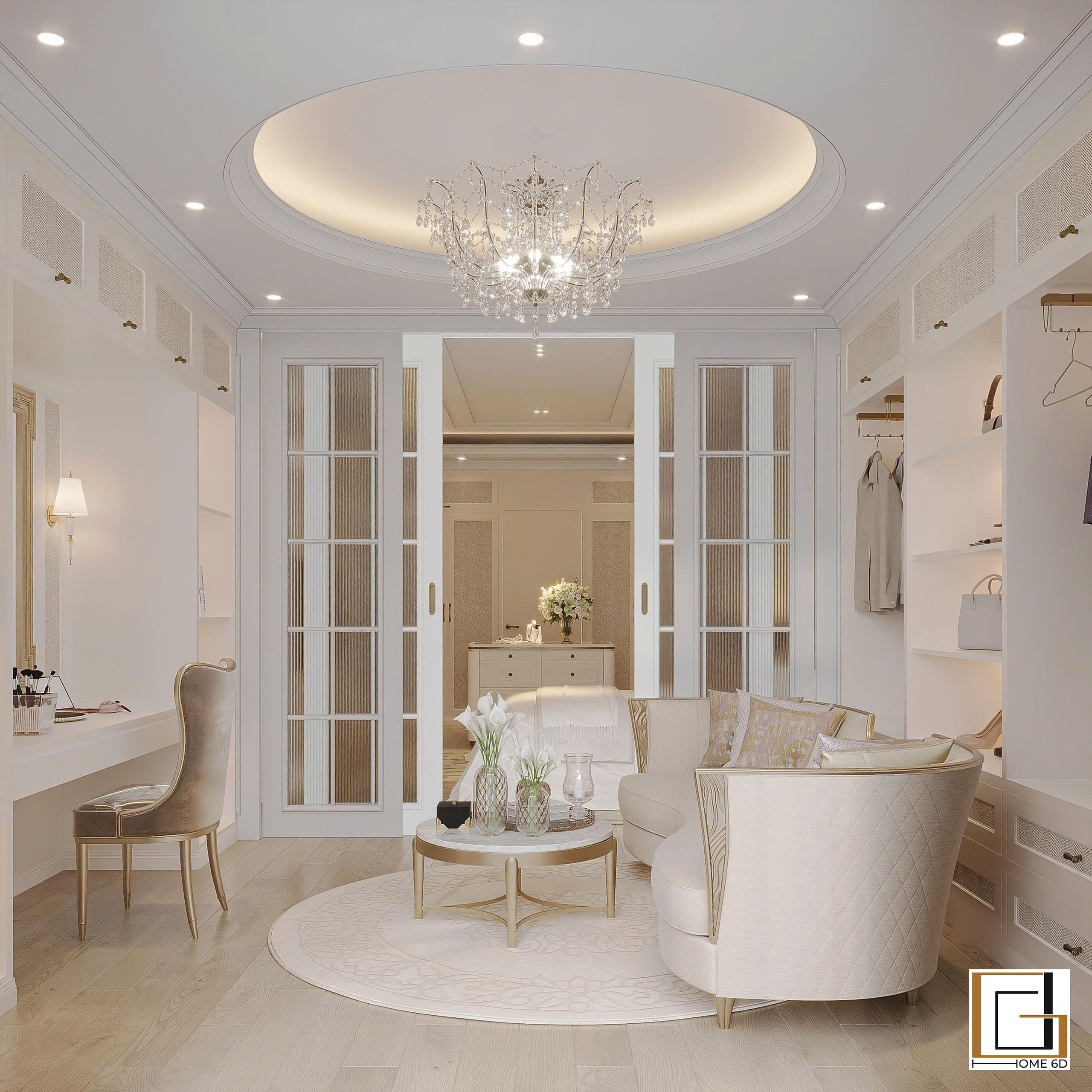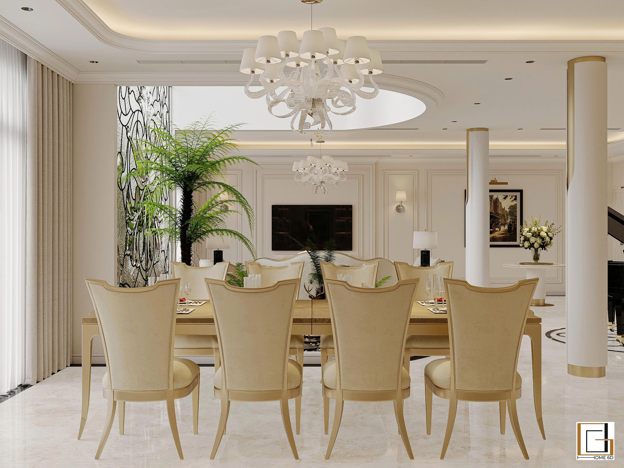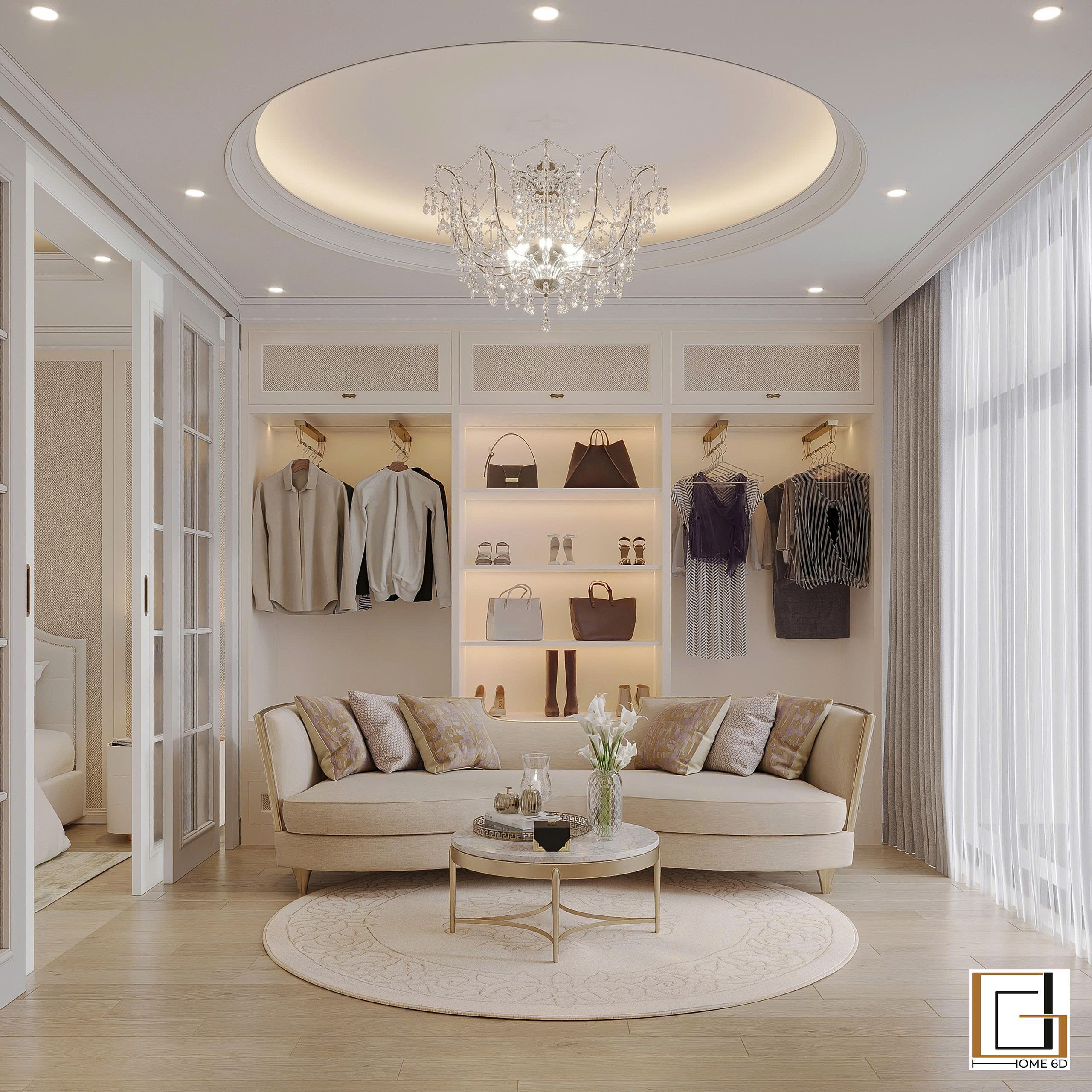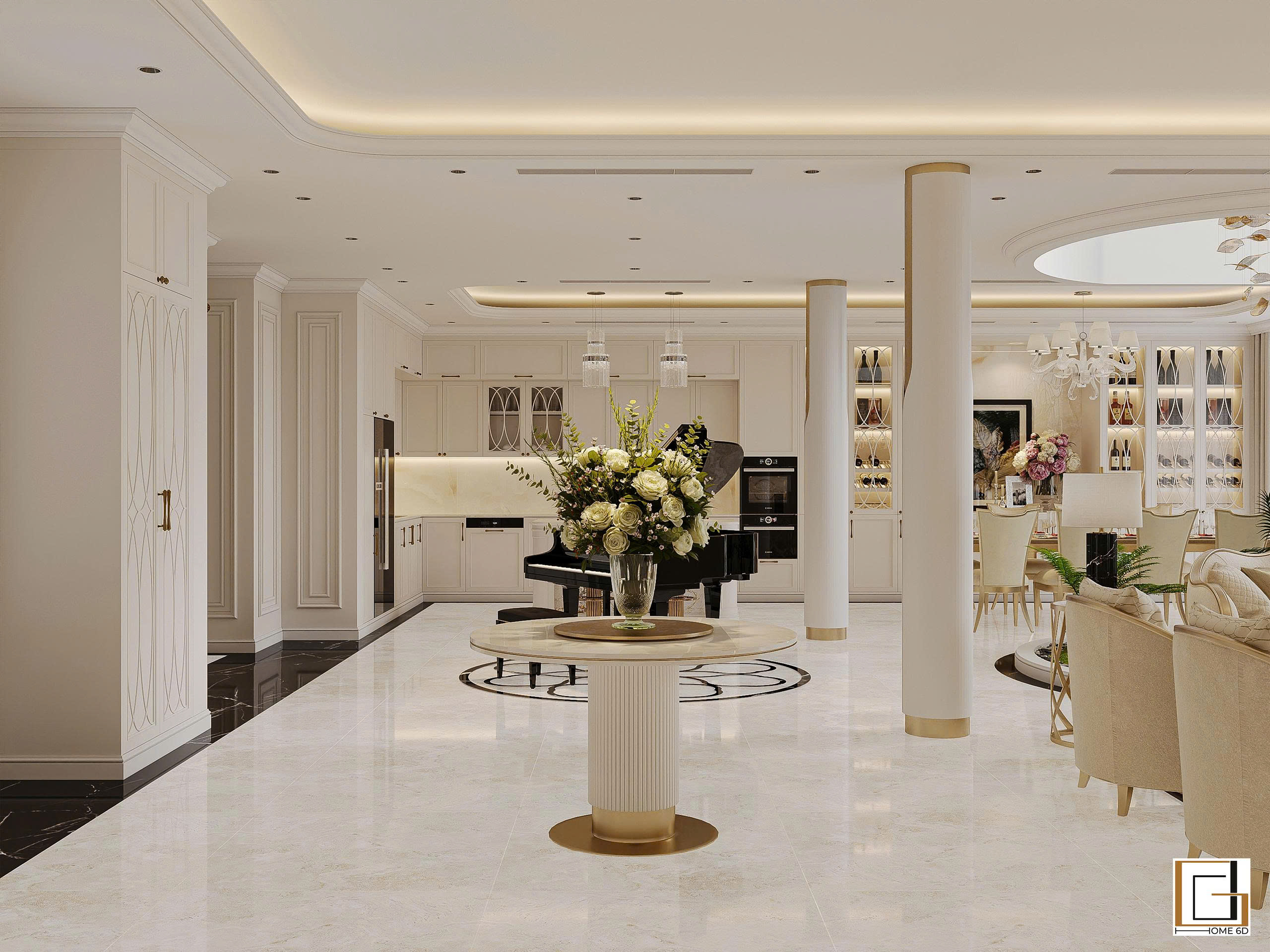 Ngay từ khi đặt chân vào không gian, người xem dễ dàng cảm nhận được vẻ đẹp tinh tế và xa hoa của phong cách Neoclassic. Các kiến trúc sư Nhà đẹp 6D đã vận dụng nhuần nhuyễn những nguyên tắc kinh điển của phong cách này: tỷ lệ cân đối, chi tiết phào chỉ tinh xảo, màu sắc trang nhã cùng cách bố trí không gian hợp lý. Mỗi khu vực chức năng trong căn nhà đều mang một cảm xúc riêng, nhưng vẫn đảm bảo tính liên kết tổng thể, tạo nên một bức tranh nội thất hài hòa, sang trọng mà không phô trương.