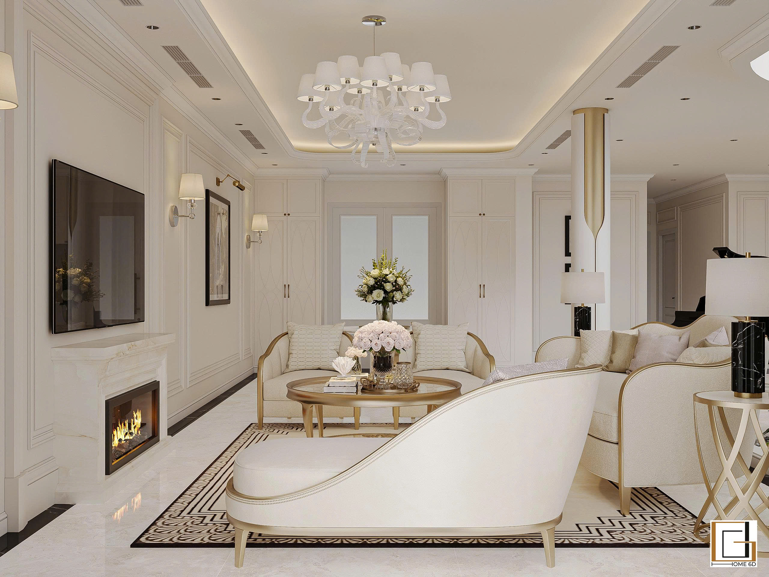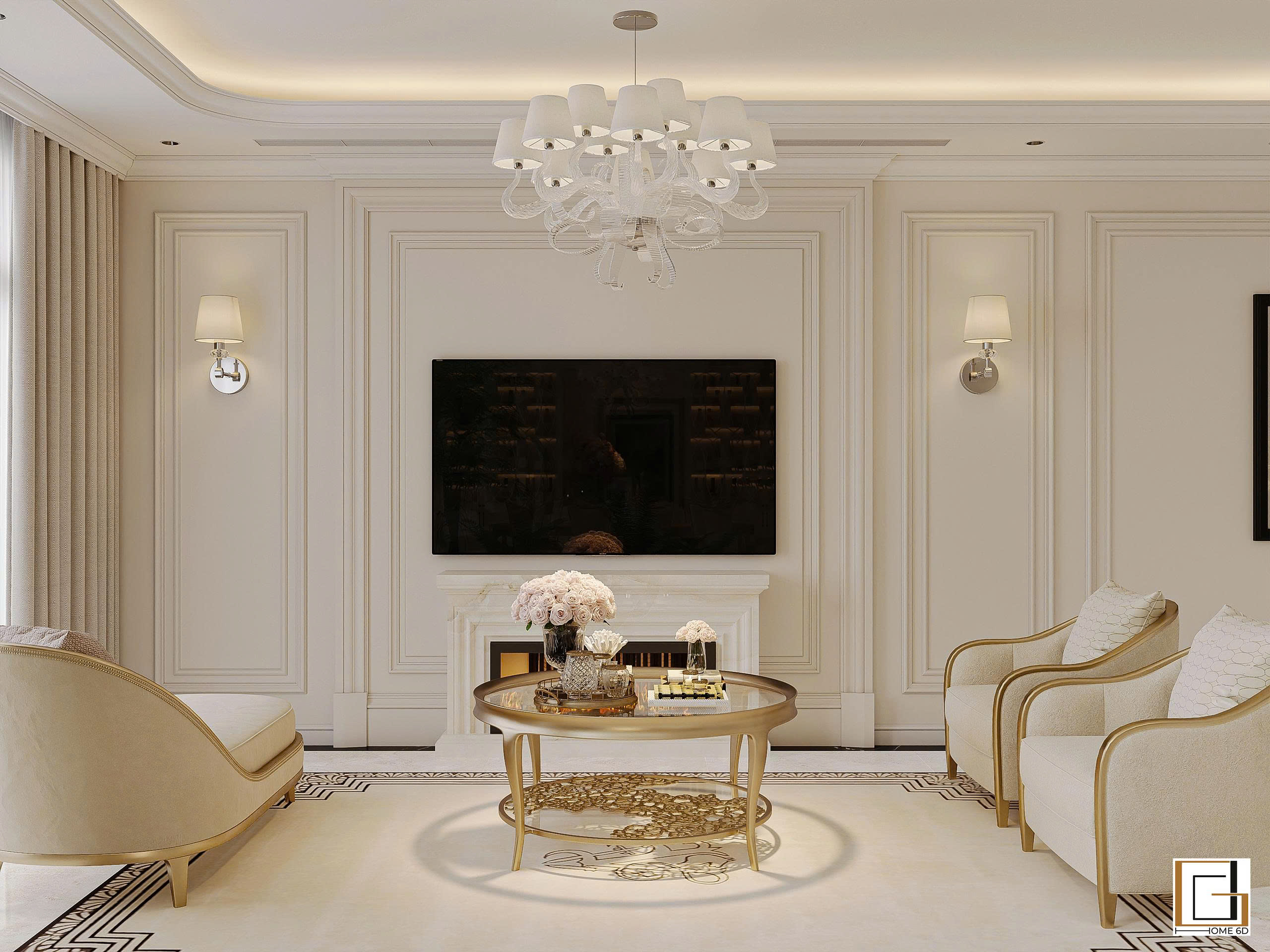 Gam màu chủ đạo được lựa chọn là trắng kem kết hợp với vàng champagne và xám nhạt, giúp không gian vừa sáng sủa vừa toát lên vẻ thanh lịch. Điểm nhấn nằm ở hệ thống đèn chùm pha lê, phào chỉ PU tinh xảo, cùng các chi tiết decor bằng kim loại ánh vàng, thể hiện gu thẩm mỹ tinh tế và vị thế của gia chủ.