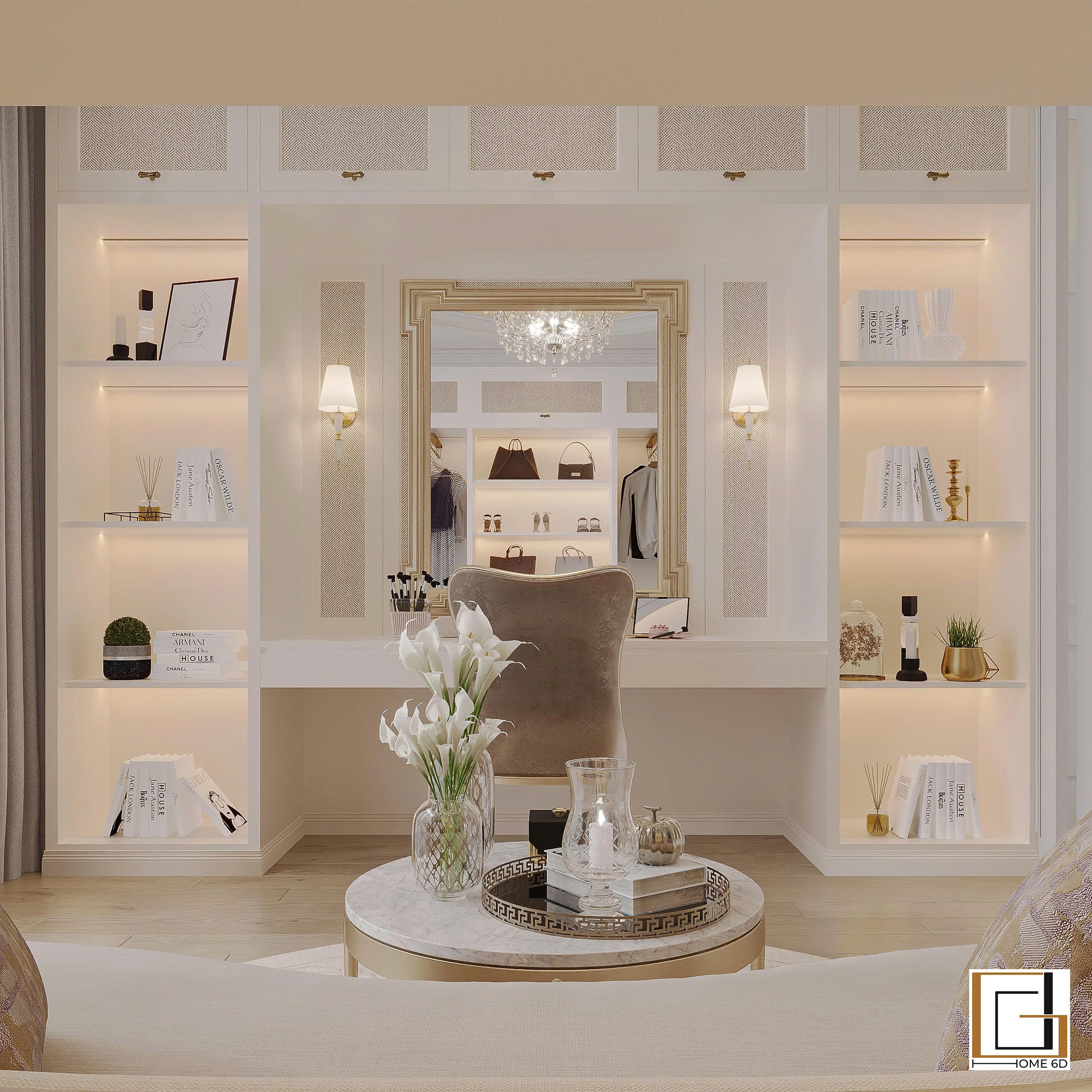 Phía đối diện là khu vực thay đồ và bàn trang điểm, được thiết kế liền mạch với phòng tắm master – nơi hội tụ tiện nghi cao cấp như bồn tắm nằm, vòi sen cây, gương cảm ứng, và hệ thống đèn led chiếu sáng tinh tế. Sự đồng bộ trong vật liệu – từ đá marble, kính cường lực đến tay nắm kim loại mạ vàng – tạo nên vẻ đẹp hoàn hảo và sang trọng cho tổng thể.
