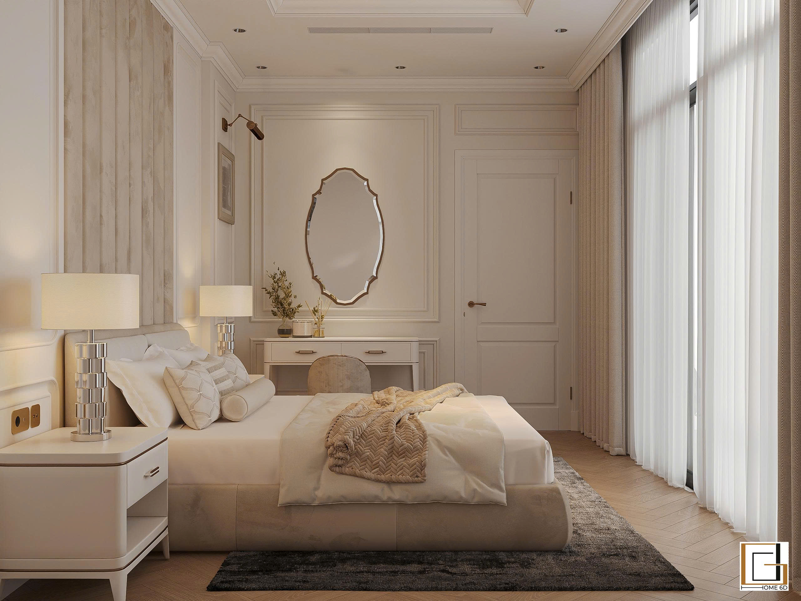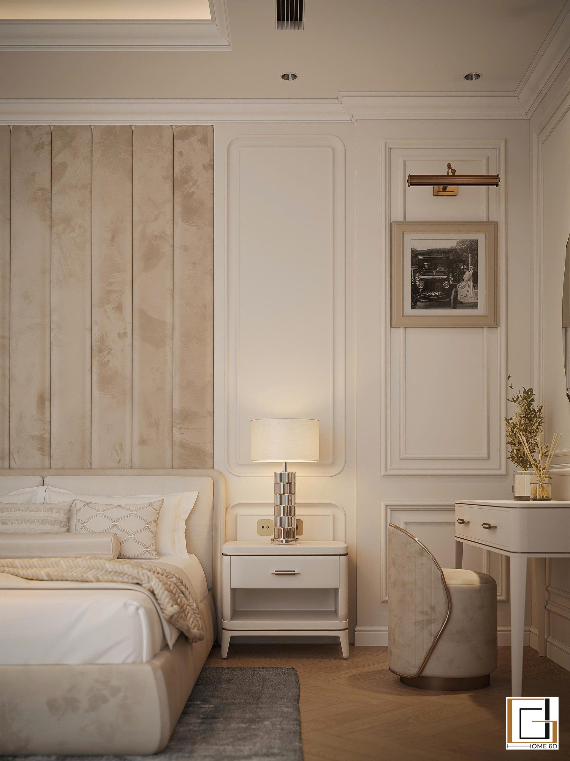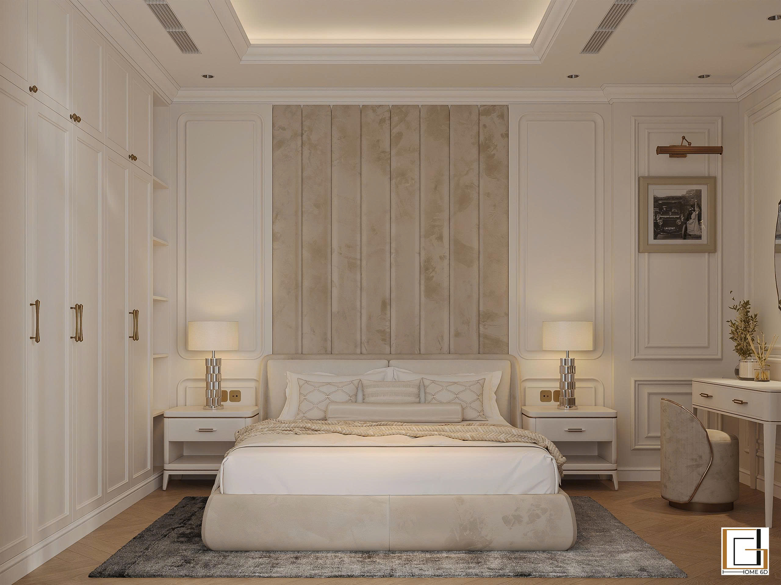 Gam màu chủ đạo là be vàng, xám nhạt và nâu trầm, tạo cảm giác ấm áp, thư giãn. Giường ngủ lớn với đầu giường bọc da chần nút, viền khung mạ vàng tinh tế là điểm nhấn trung tâm. Hai bên giường được bố trí đèn ngủ kiểu cổ điển, giúp cân bằng ánh sáng và mang lại sự lãng mạn, nhẹ nhàng cho không gian.