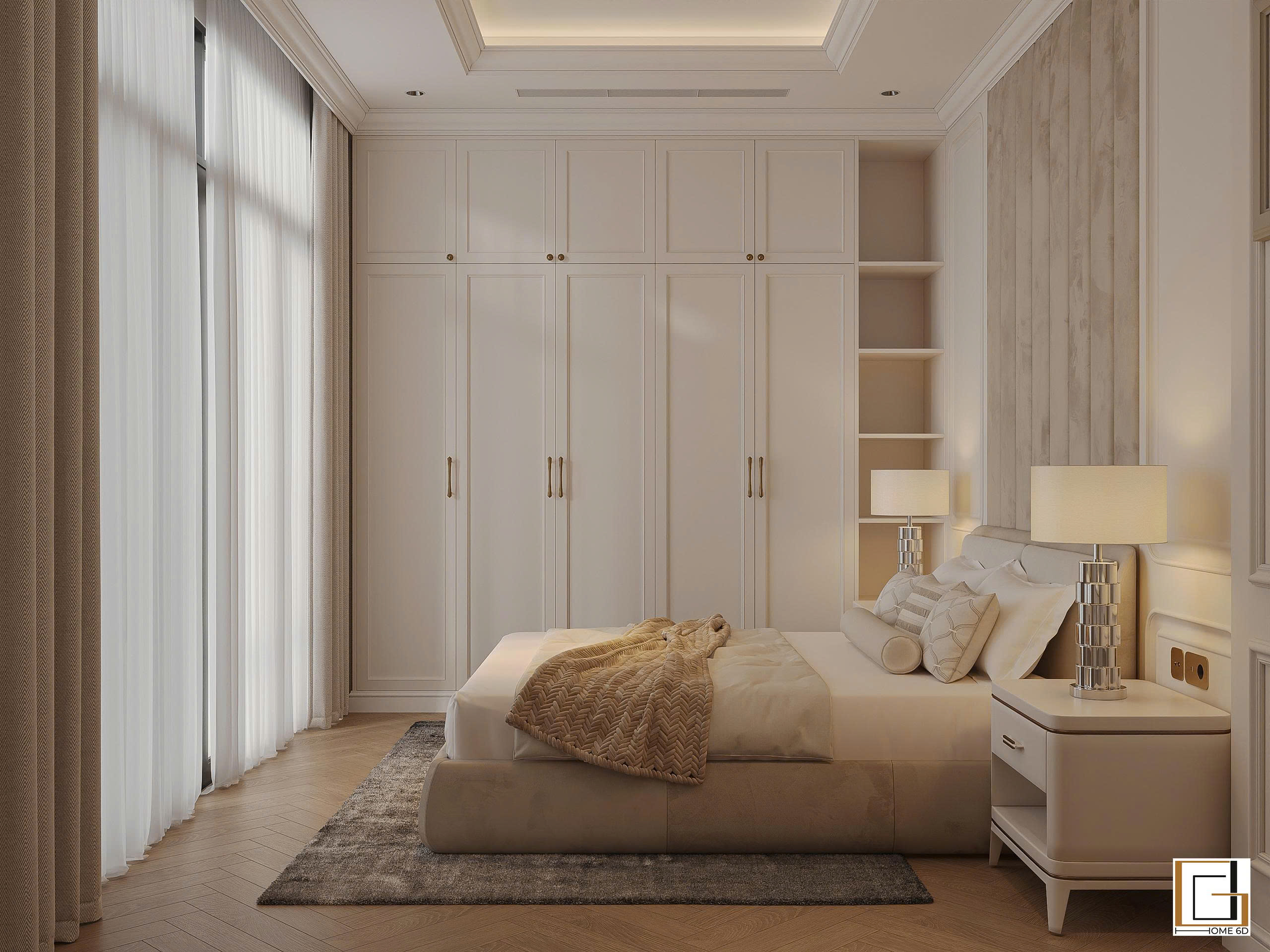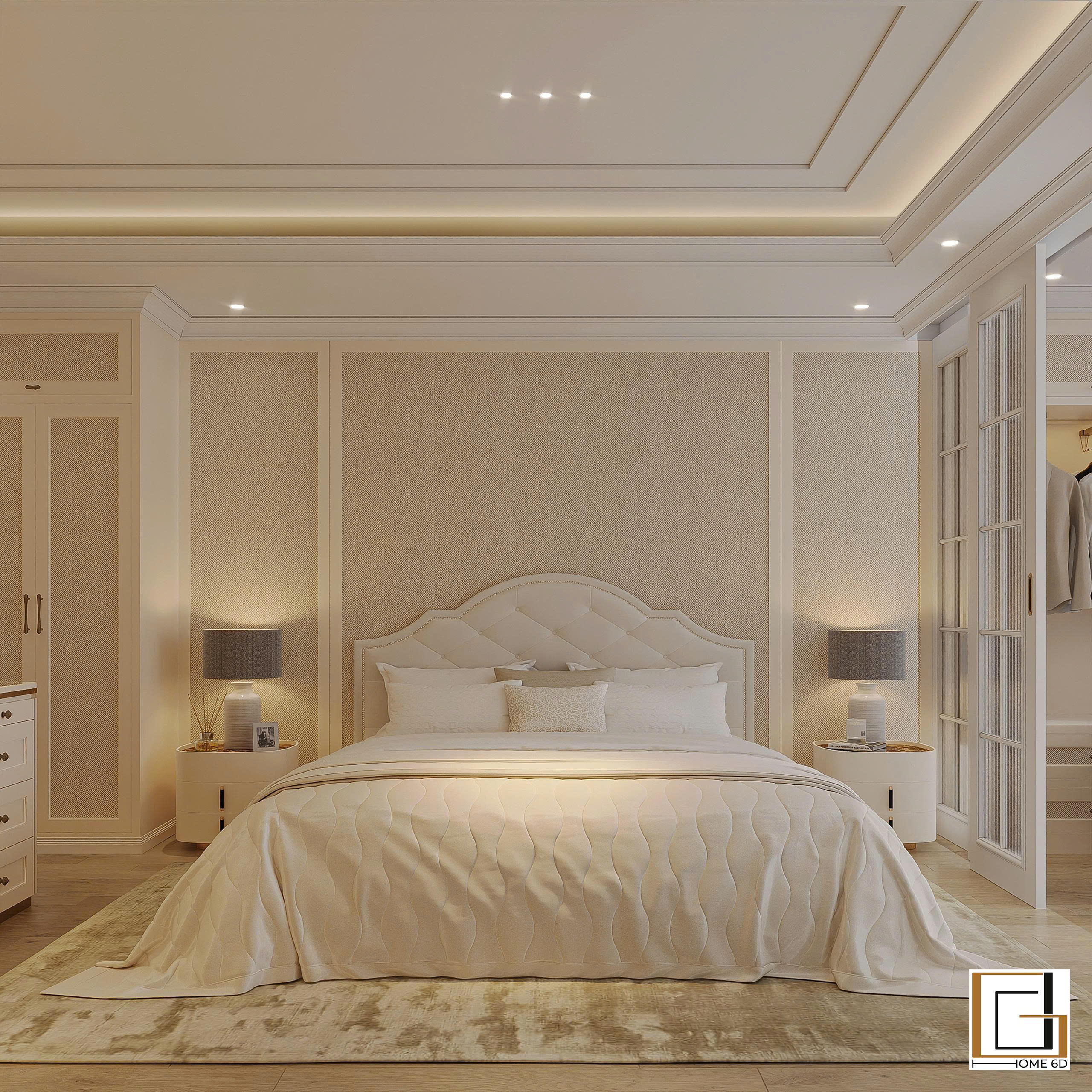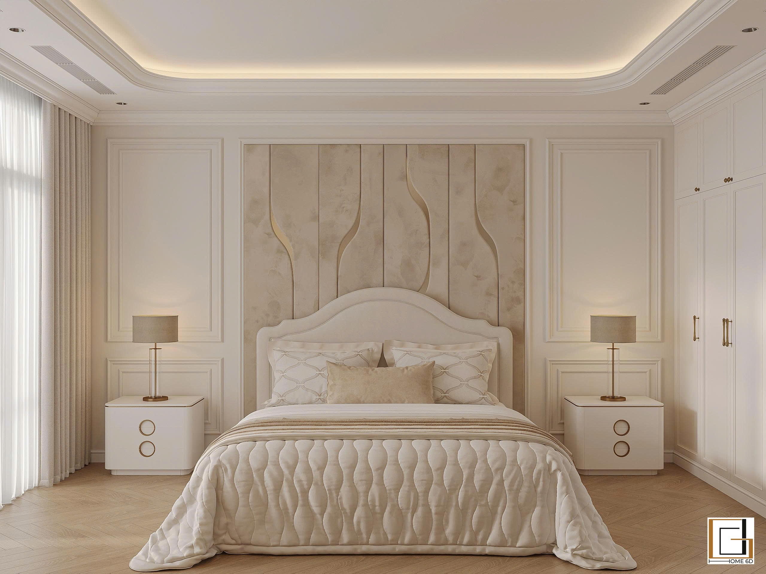 Gam màu chủ đạo là be vàng, xám nhạt và nâu trầm, tạo cảm giác ấm áp, thư giãn. Giường ngủ lớn với đầu giường bọc da chần nút, viền khung mạ vàng tinh tế là điểm nhấn trung tâm. Hai bên giường được bố trí đèn ngủ kiểu cổ điển, giúp cân bằng ánh sáng và mang lại sự lãng mạn, nhẹ nhàng cho không gian.
