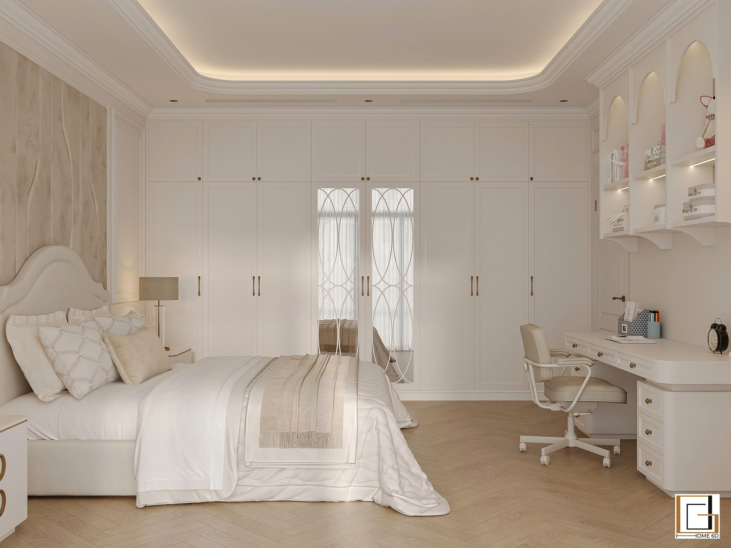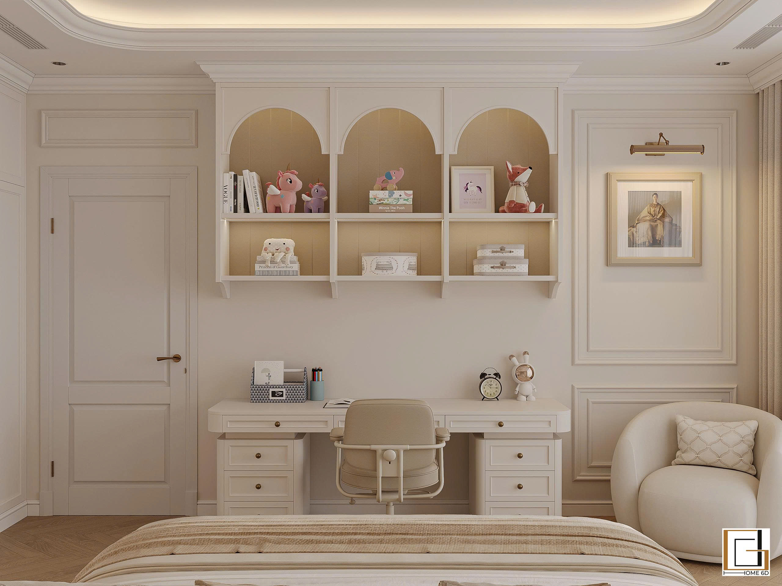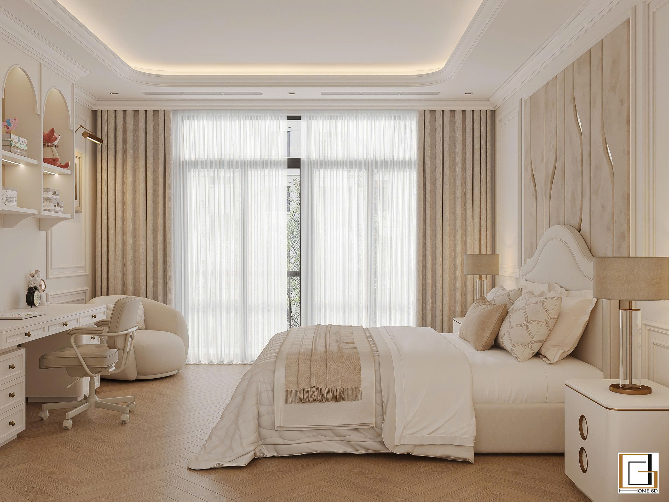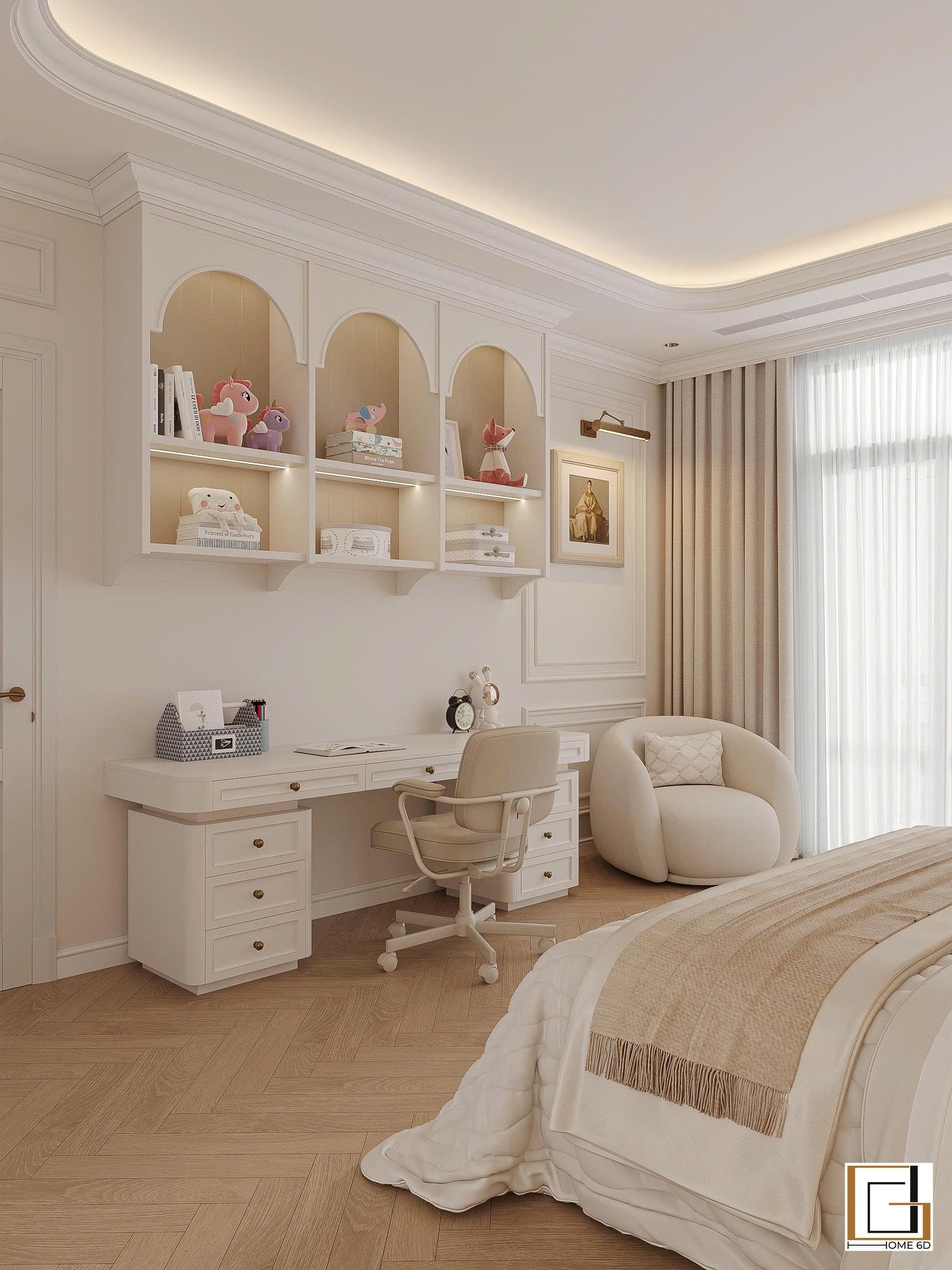 Nếu phòng master là biểu tượng của quyền lực và sự sang trọng thì phòng ngủ con gái lại là điểm nhấn nhẹ nhàng, đầy cảm xúc trong tổng thể thiết kế. Lấy cảm hứng từ phong cách Neoclassic trẻ trung, căn phòng được phủ bởi gam màu pastel hồng phấn và trắng kem, tạo cảm giác dễ chịu và nữ tính.