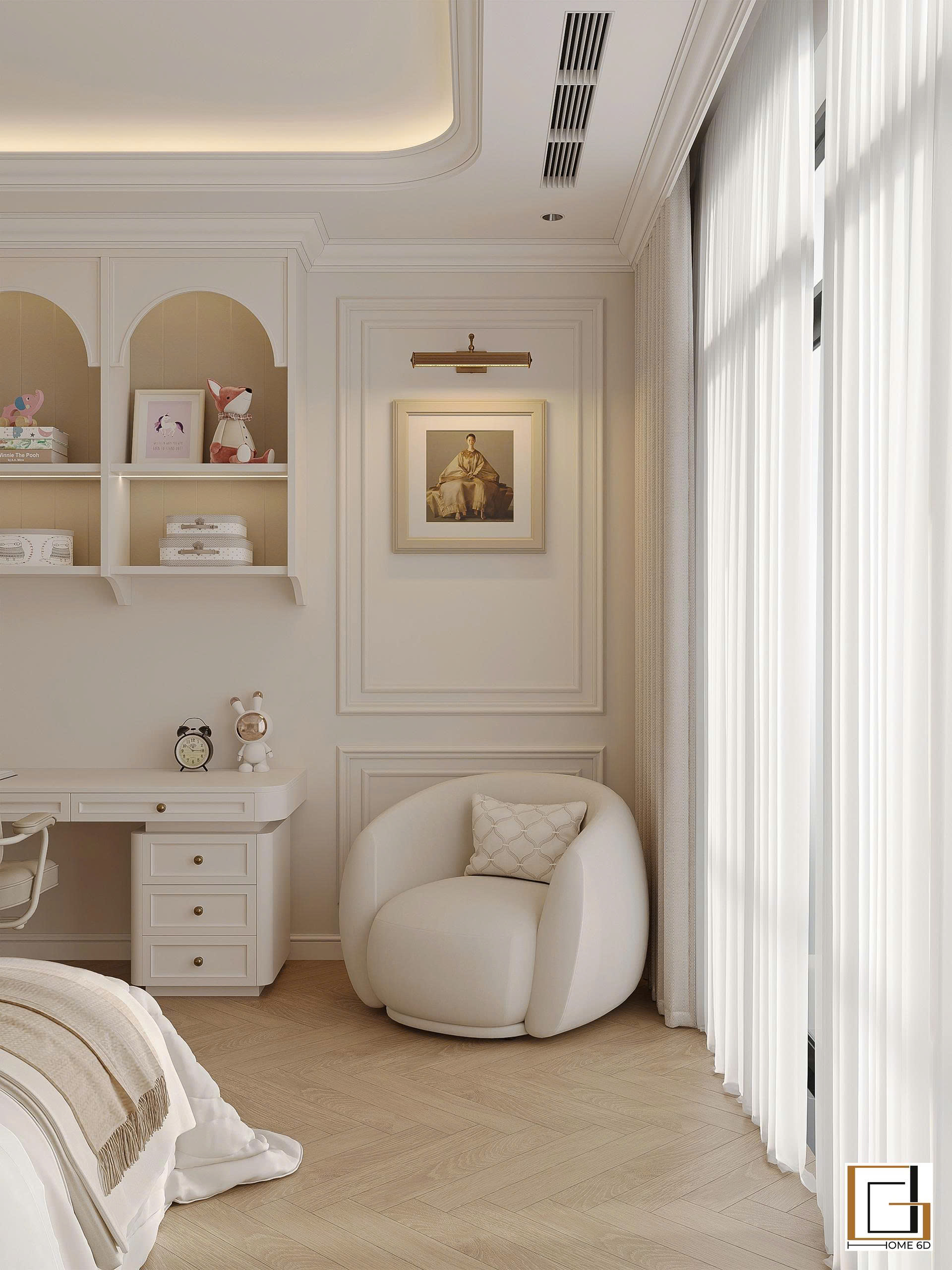 Nhà đẹp 6D đã tinh tế khi thêm vào một vài chi tiết decor như tranh treo tường nghệ thuật, rèm voan mềm mại và ghế nghỉ cạnh cửa sổ, giúp căn phòng thêm phần sinh động mà vẫn giữ được nét thanh lịch. Tất cả tạo nên một không gian nhẹ nhàng, ngọt ngào – nơi cô gái nhỏ có thể thỏa sức sáng tạo và tận hưởng thế giới riêng của mình.